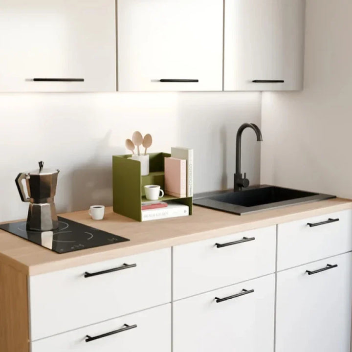 BUCHHALTER*IN schafft Platz und Ordnung in deinem Bücherregal, in der Küche, im Büro... Durch die Treppenform kannst du die Tiefe deines Regals komplett ausnutzen, ohne den Überblick über deine Lieblingsbücher zu verlieren. So passen z.B. in einem tiefen BILLY Regal (40 cm) bis zu 3 Standard-Taschenbücher hintereinander.