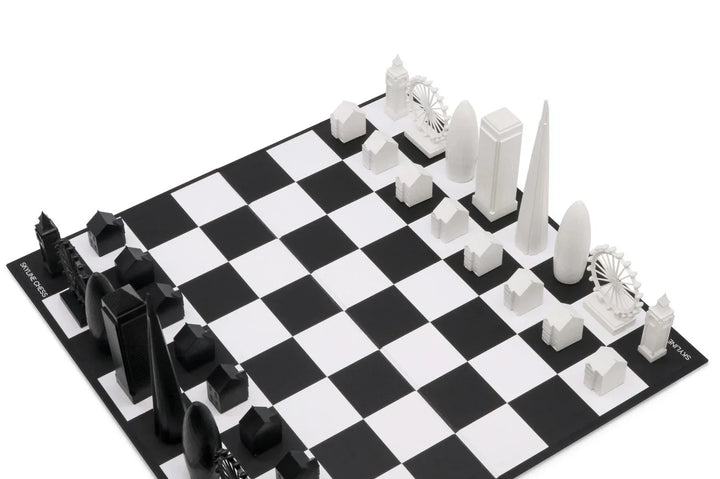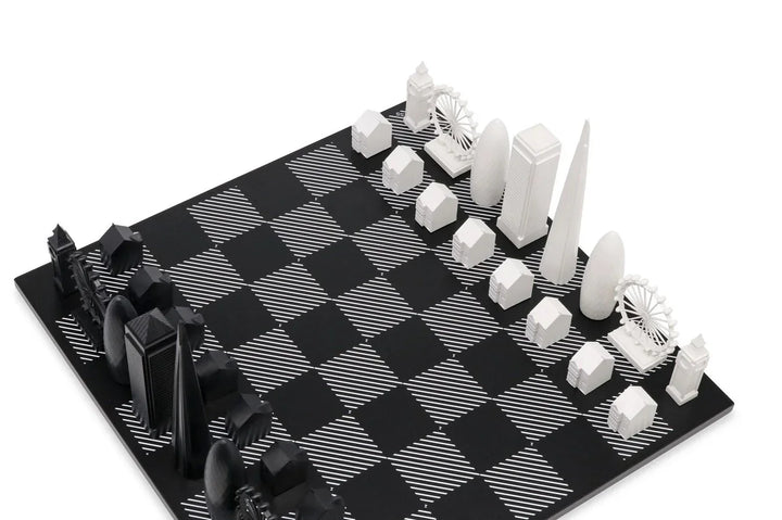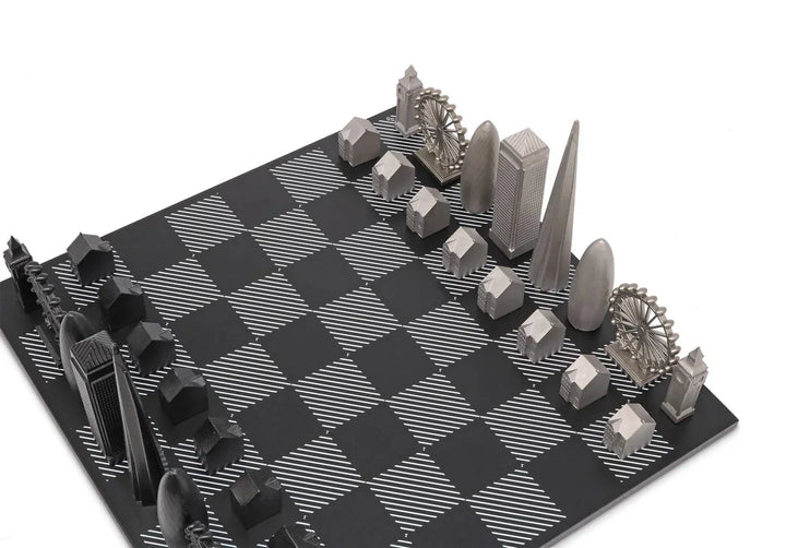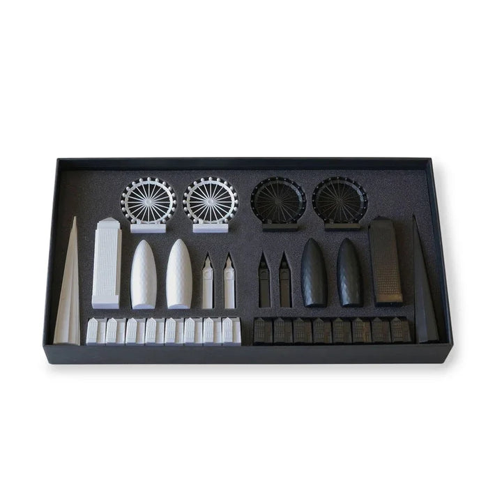 A carefully selected chess piece curation of London's iconic skyline, featuring a selection of London's most significant architecture; including Big Ben, London Eye, St Mary Ax, The Shard and Canary Wharf 32 piece set available in injection molded acrylic or stainless steel.