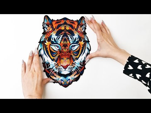 Auf einem Holztisch wird ein farbenfrohes, kunstvolles Tiger-Puzzleteil ausgestellt, das sanft von einer Hand berührt wird, und in der Nähe befinden sich Dekorationsgegenstände.